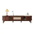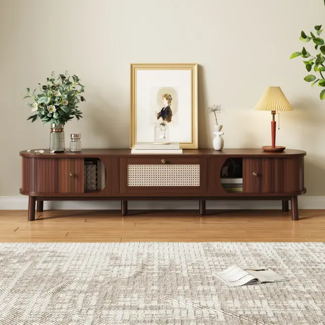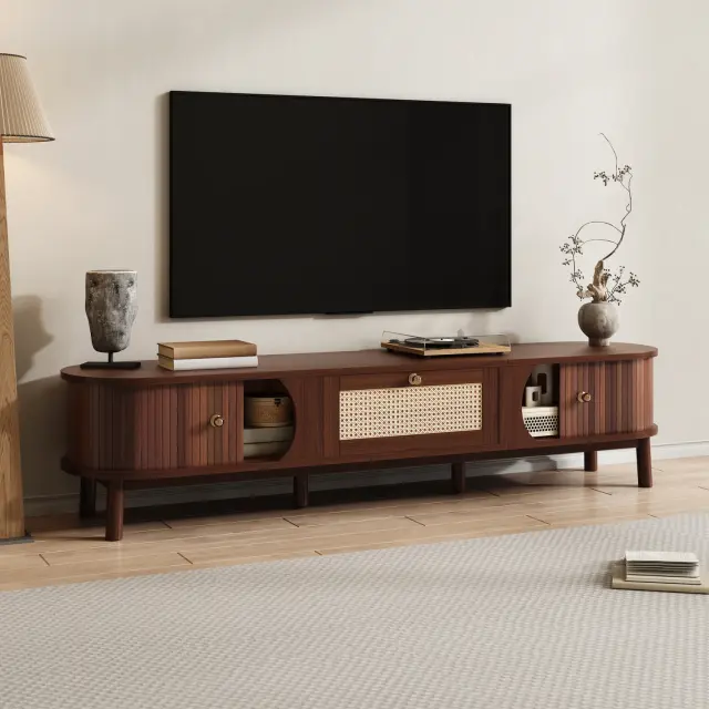 TV omarica iz naravnega lesa z vrati in predali iz ratana.