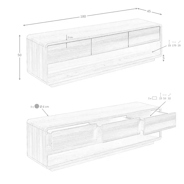 TV omarica sodobnega dizajna s konstrukcijo iz naravnega orehovega furnirja in originalno osnovo iz naravnega orehovega furnirja. Ima prostoren prostor za shranjevanje s 3 predali z ročnim odpiranjem in sistemom mehke zapore.