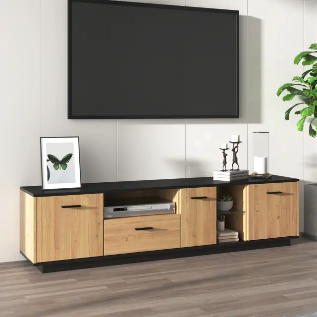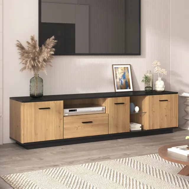 TV omarica s predalom, 3 vrata, 2 odprta predelka, LED luči. Črna/naravni les.
