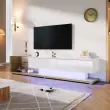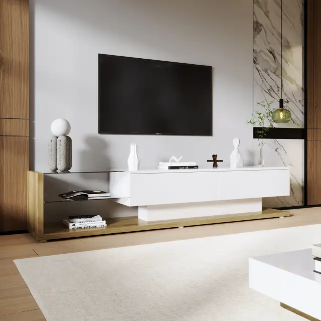 TV omarica v beli in leseni barvi z visokosijajnim lesom in LED osvetlitvijo. Združuje podeželski slog z modernim dizajnom.