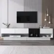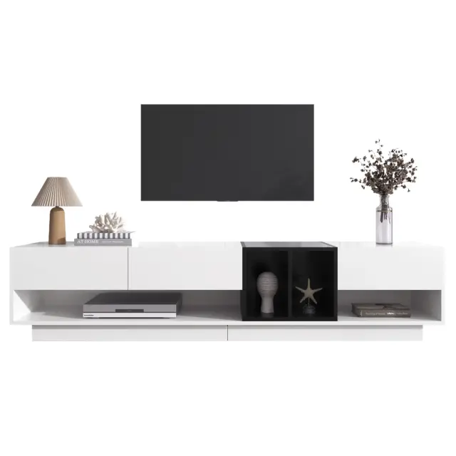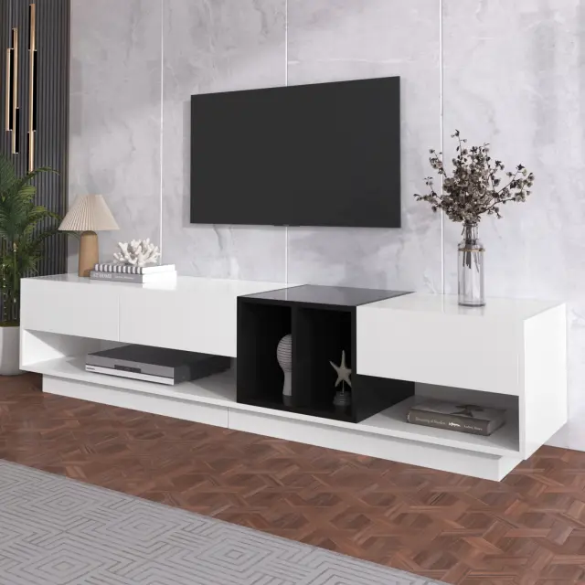 TV omarica v visokosijajni beli in črni barvi s predali in več prostori za shranjevanje.