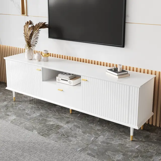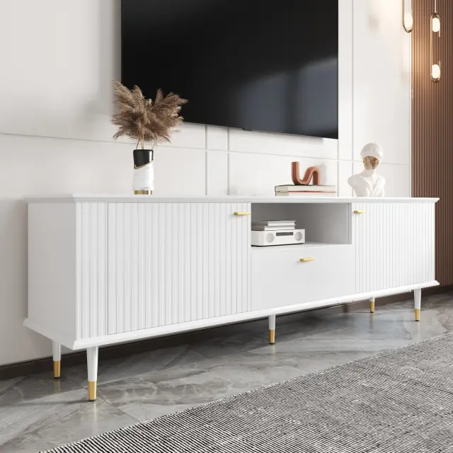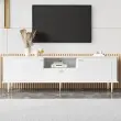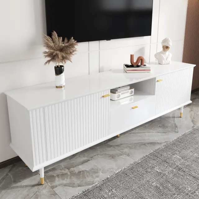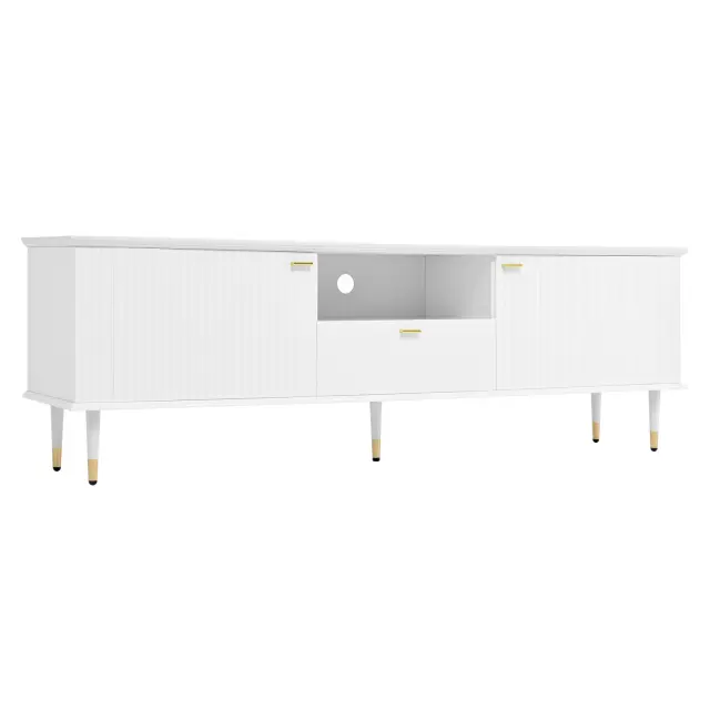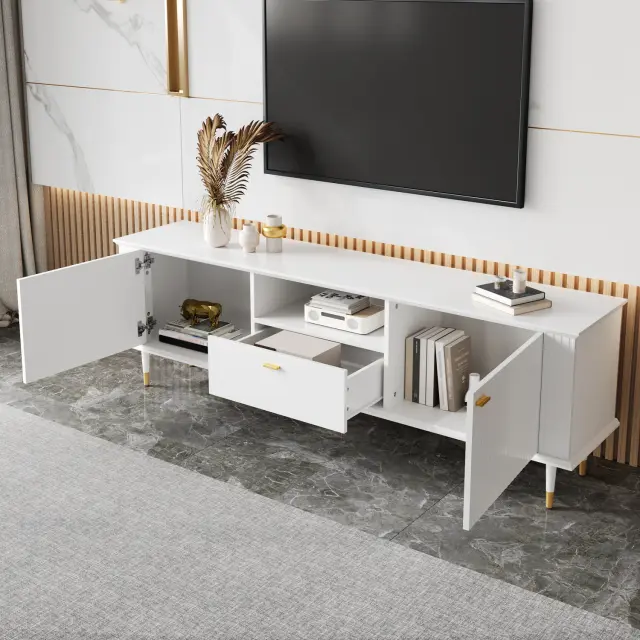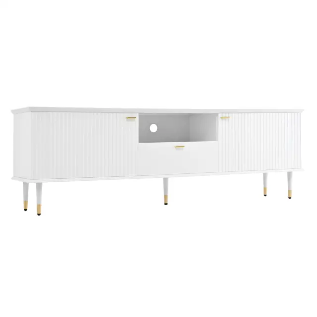 TV omarica z odprtimi predelki in predali, lakirana, z mehkim zapiranjem.