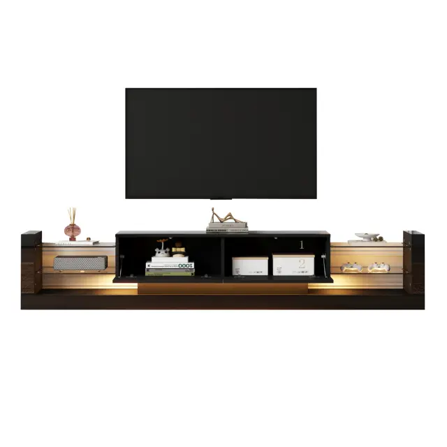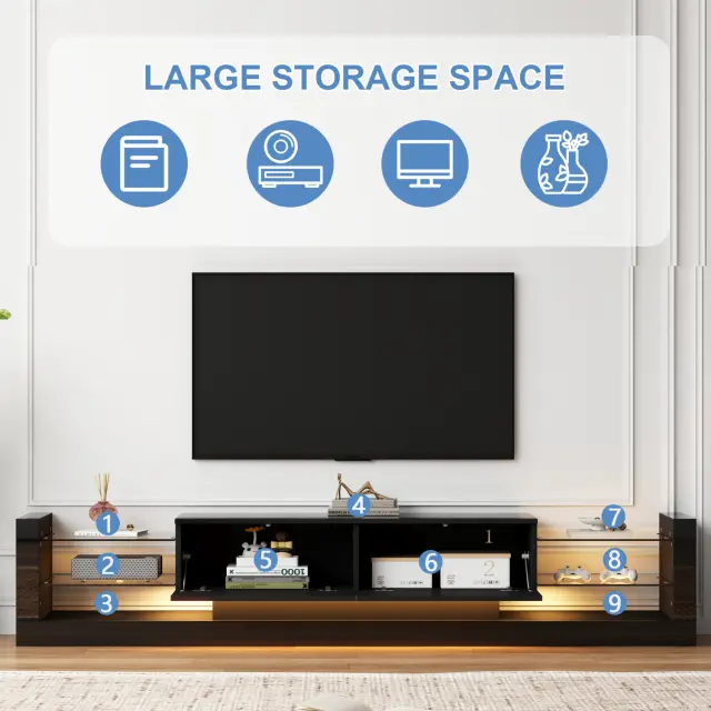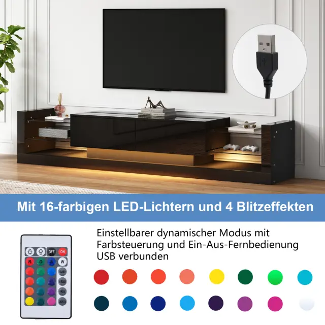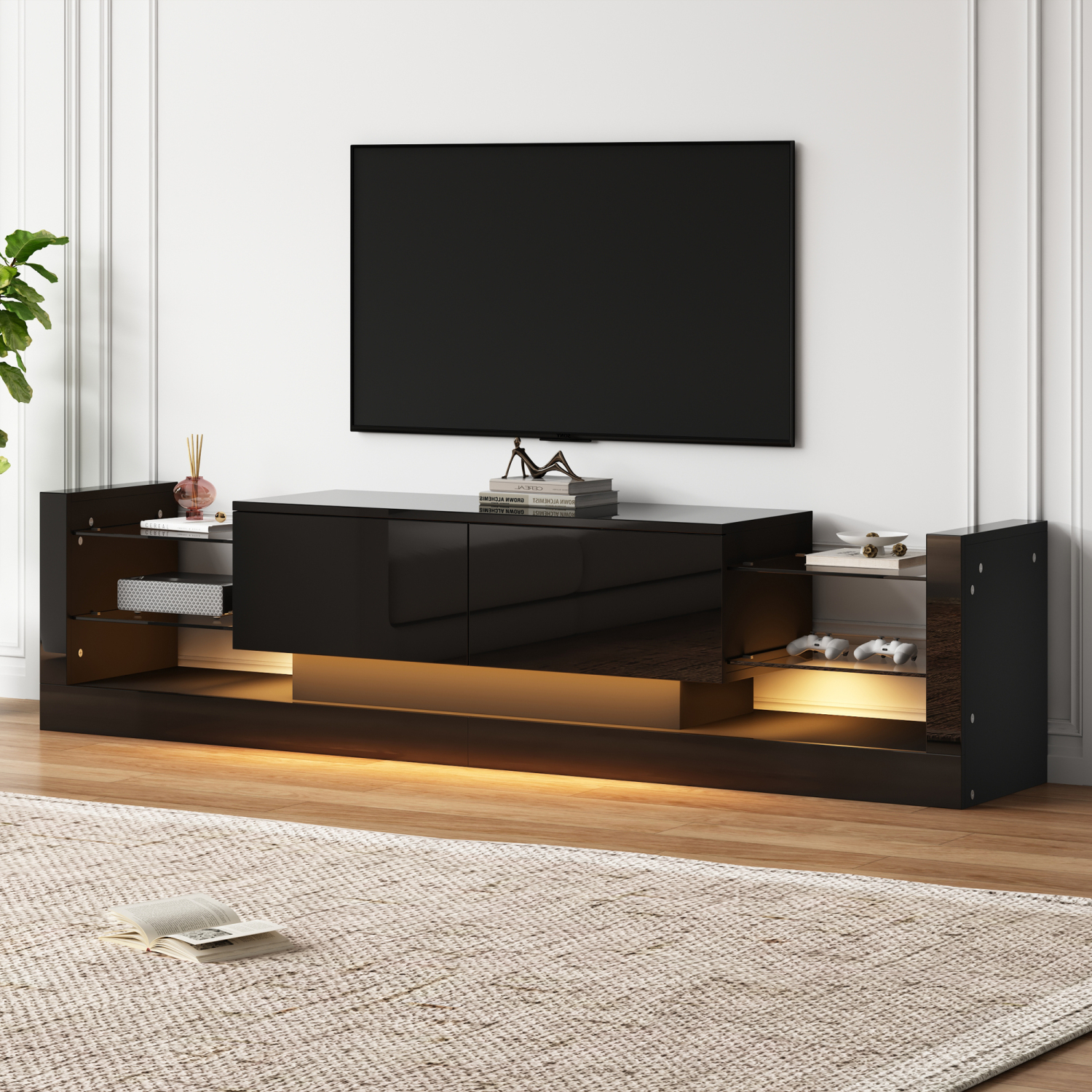 TV omarica z visokim sijajem in LED osvetlitvijo, 181 cm – za televizorje do 80 palcev, steklena sprednja stran, 2 zložljiva predala