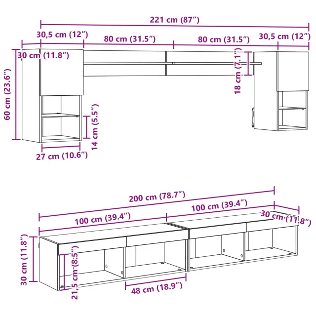 Moderne TV stenske enote z LED ponujajo odlično kombinacijo funkcionalnosti in svežega sloga za tvoj dnevni prostor. Te enote so zasnovane kot stenske omare, tako da skorajda ne zasedajo tal in nudijo odlične shranjevalne rešitve, povsem primerne za sodobne, minimalne interierje. Z izrazitimi pravokotnimi oblikami in konstrukcijo iz inženirskega lesa, njihovi geometrijski robovi in natančna izdelava dodajajo sodobno eleganco vsakemu prostoru. Elegantna večbarvna LED osvetlitev subtilno dvigne razpoloženje in ustvari prijetno vzdušje.