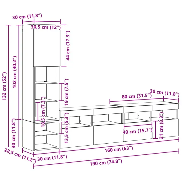 • 1 x TV stenski kabinet: 30,5 x 30 x 120 cm (Dolžina x Širina x Višina)