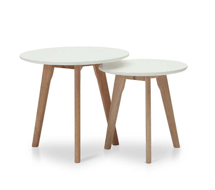 Komplet dveh nordijsko oblikovanih mizic za kavo ali stranskih mizic. Izdelano iz MDF in hrasta. V okolje prinašata naravno vzdušje in prefinjenost. Samo za notranjo uporabo. NOSILNOST 150 KG.