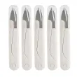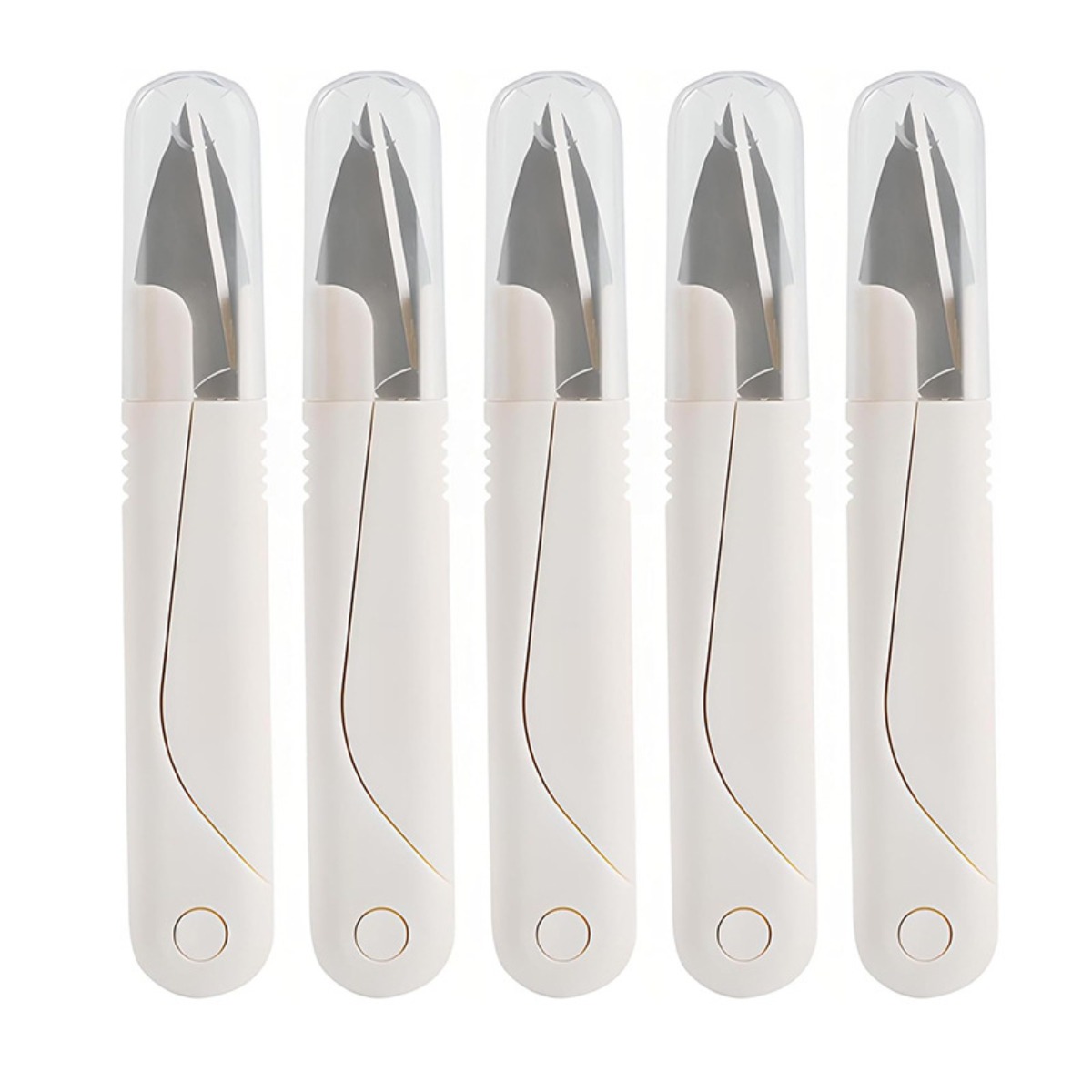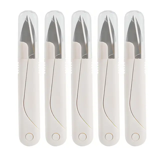 Zaščitne kapice: Prosimo, upoštevajte: to niso originalni deli. Vsake škarje so opremljene z zaščitno kapico, ki ščiti rezila iz nerjavnega jekla in preprečuje neprijetna zatikanja ali poškodbe. Kapice ohranjajo rezila pokrita med shranjevanjem ali prenašanjem, kar naredi ta 5-paket priročen za krojače, hobiste in DIY ustvarjalce, ki potrebujejo varen in organiziran dostop do več rezil.