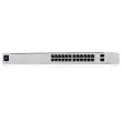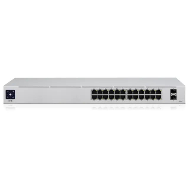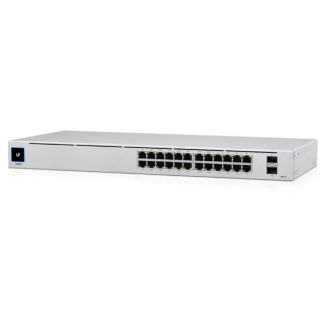 USW-24-POE je nastavljivo stikalo Gigabit Layer 2 s štiriindvajsetimi gigabitnimi Ethernet vrati, vključno s šestnajstimi samodejno zaznavnimi vrati 802.3at PoE + in dvema SFP priključkoma.