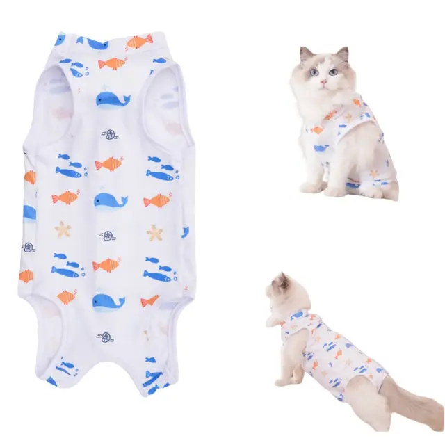 Vsestranska uporaba: Poleg uporabe po sterilizaciji je ta obleka primerna tudi za druge namene. Lahko se uporablja za zaščito ran po drugih operacijah, za preprečevanje lizanja pri kožnih boleznih ali alergijah, ter za pomiritev mačke v stresnih situacijah, kot so obiski veterinarja ali potovanja. Pisani potiski dodajo obleki estetski videz, hkrati pa ohranjajo funkcionalnost in udobje.