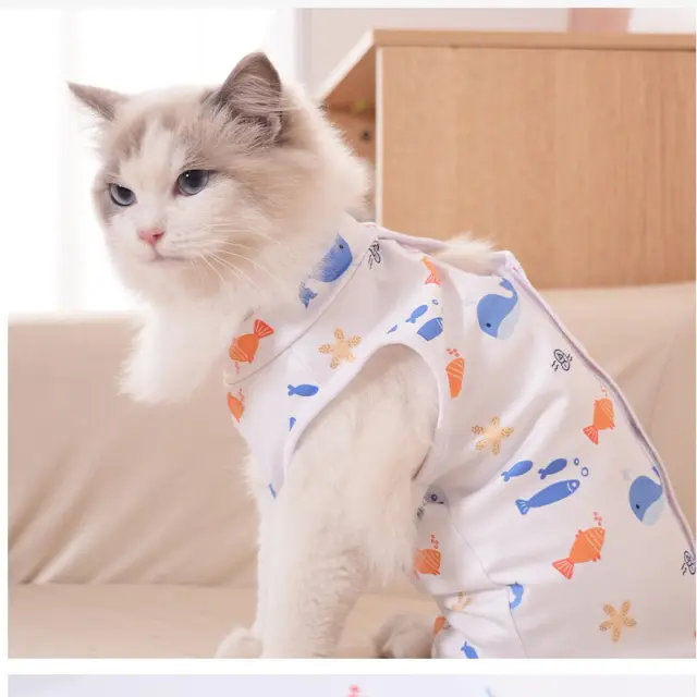 Vsestranska uporaba: Poleg uporabe po sterilizaciji je ta obleka primerna tudi za druge namene. Lahko se uporablja za zaščito ran po drugih operacijah, za preprečevanje lizanja pri kožnih boleznih ali alergijah, ter za pomiritev mačke v stresnih situacijah, kot so obiski veterinarja ali potovanja. Pisani potiski dodajo obleki estetski videz, hkrati pa ohranjajo funkcionalnost in udobje.