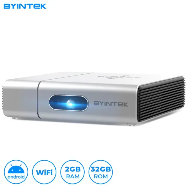 BYINTEK UFO U50 Pro je vrhunski prenosni pametni projektor, ki vas bo presunil s svojo funkcionalnostjo in uporabnostjo. Projektor ima napreden operacijski sistem Android, vgrajen spomin 2GB RAM + 32GB ROM, kakovostno strojno opremo, ki mu omogoča predvajanje v ločljivosti Full HD 1080p. Dodatne prednosti projektorja so tudi: MEMC tehnologija, predvajanje 3D vsebin, funkcija brezžičnega deljenja zaslona, visokokakovostni zvočniki in še in še!