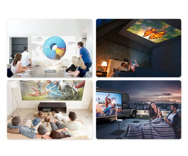 Prepustite se, da projektor poskrbi pri popestritvi vaših praznovanj, prikazu poslovnih predstavitev v sejni sobi, oglaševanju, promociji, tematskih večerih v dvoranah, ogledu filmov, brskanju po internetu, igranju igric, projekciji na avtodom ali počitniško prikolico - kjerkoli in kadarkoli!