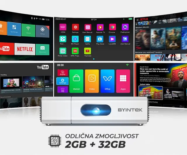 • WiFi & Bluetooth - Zahvaljujoč dvopasovnemu WiFi povezovanju in vgrajeni Bluetooth povezavi, lahko uporabljate internet in projektor povezujete z ostalimi zunanjimi pametnimi napravami.