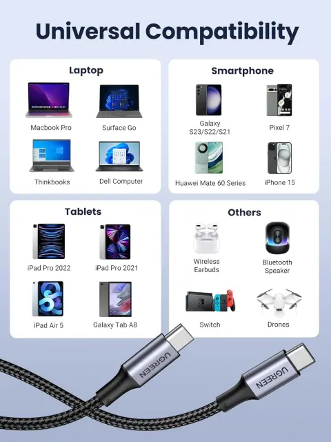 Ta polnilni kabel USB C je združljiv z MacBook Pro 16"/M3, MacBook Air 2022, ThinkPad-XL, HP EliteBook, Surface Pro 8, iPhone 15/Plus/Pro/Pro Max, Galaxy S24 S23 Ultra, Pixel 7 Pro, Huawei P60/Mate 60 Pro, iPad Pro 2022, iPad Air 5