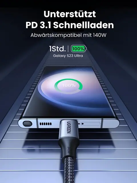 za polnjenje zadostuje 140 W polnilni kabel. Primeren je za hitro polnjenje naprav USB-C od prenosnih računalnikov z visoko zmogljivostjo, tabličnih računalnikov do majhnih naprav, kot so pametni telefoni in slušalke Bluetooth. Združljiv je z MacBook Pro 2023 2022 2021, MacBook Air 2022 2021, MateBook, Spectre X360, XPS 13, Gaming Laptop, iPad Pro 12.9 2021, iPad Air 6, iPad Mini 6, Galaxy S23 Ultra S23+ S2 S21 S20 itd.