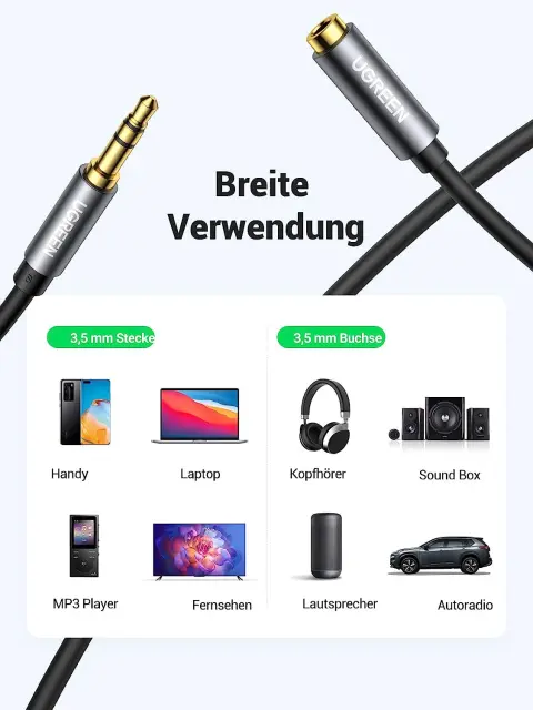 UGREEN Aux podaljšek je optimalna rešitev za podaljšanje Aux kablov in zaščito priključka avdio naprav.