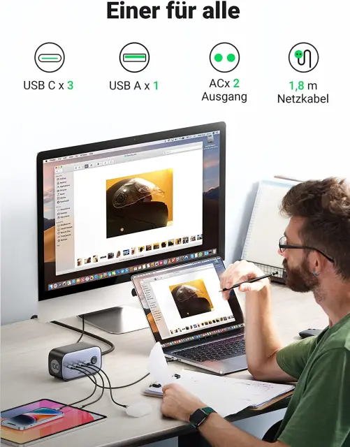 karkoli počnete, polnilnik USB C zagotavlja moč in zmogljivost za to. S 100 W močjo visoke hitrosti lahko svoj novi MacBook Pro napolnite od 0 do 51 % v samo 30 minutah. USB-C1 za MacBook Air USB-C2 za iPhone 14 Pro USB-C3 za AirPods. 2 vtičnici za Mac Mini in monitor. Vse se zdi, kot da sta ustvarjena drug za drugega. Ker je tako kot popolna ekipa.