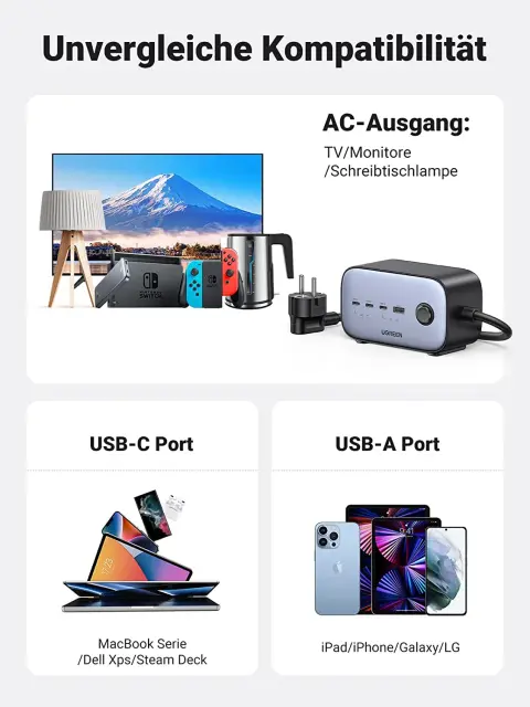 od 100 W USB-C do 3680 W AC vtičnic - napajalni razdelilnik Ugreen 100 W DigiNest Cube 6 v 1 je narejen za vas, da ste resnično produktivni. Napajalnik z močjo 100 W z USB-C in vtičnicami združuje 3 x USB-C, 1 x USB-A in 2 x vtičnice ter zagotavlja, da je pri hitrem polnjenju vse gladko in enostavno.