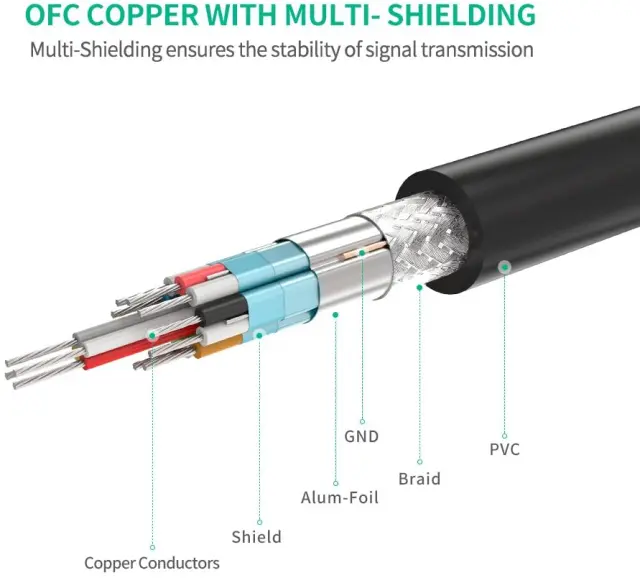 Trojni ščit s čisto bakreno žico, kar najbolj zmanjša zunanje motnje signala za prenos podatkov, pozlačeni konektorji z vrhunskim PVC-jem nudijo večjo vzdržljivost in fleksibilnost.