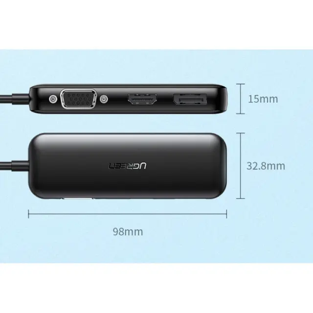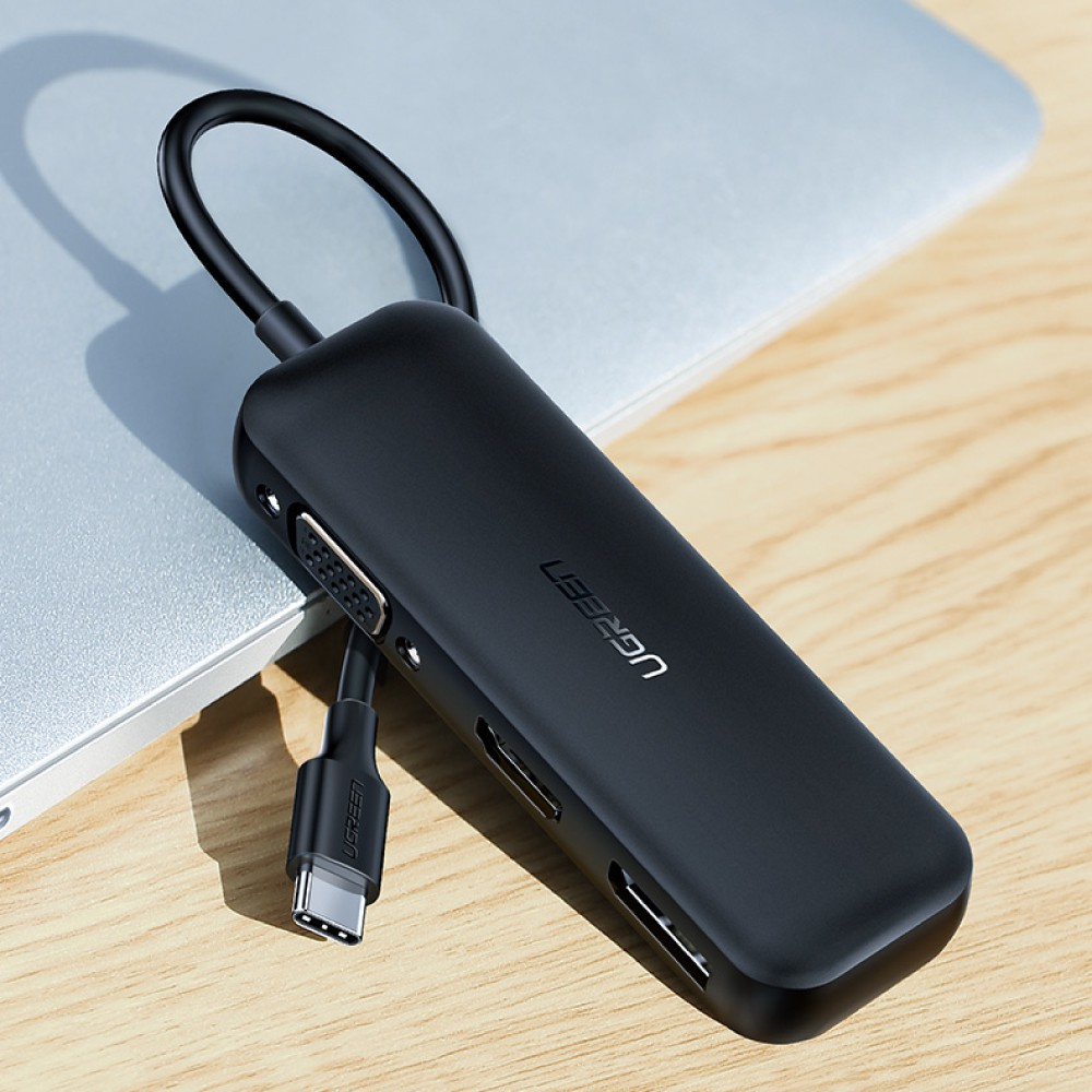 Ugreen Hub USB-C na VGA+HDMI+DP je video Hub, ki podpira pretvorbo signala iz USB-C na VGA, HDMI ali DisplayPort.