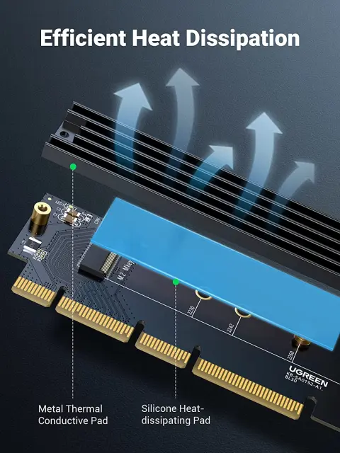 Hladilno telo je zasnovano za boljše odvajanje toplote, ima 2 silikonski blazinici za izboljšanje odvajanja toplote SSD.