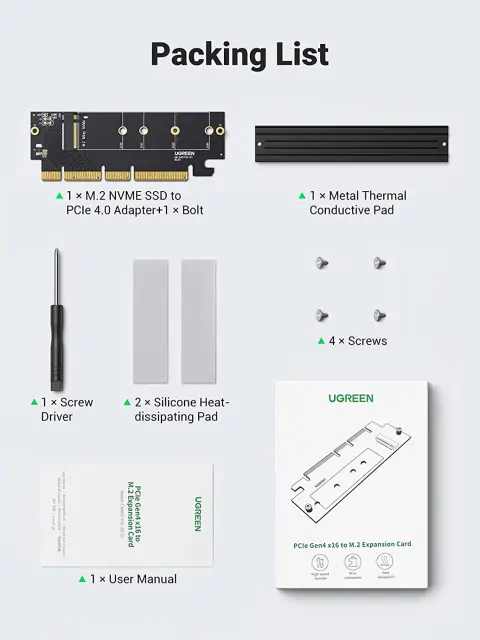 1 x adapter M.2 NVMe v PCIe s hladilnikom, 2 x silikonske blazinice za odvajanje toplote, 4 x vijaki, 1 x izvijač.