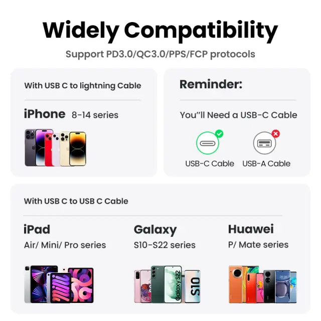 Skupaj s protokoli hitrega polnjenja za novo generacijo pametnih telefonov in izboljšanim prilagodljivim polnjenjem PPS dobi Nexode združljivost, ki je drugi napajalniki preprosto ne omogočajo. Združljivo z iPhone 14, 14 Plus, 14 Pro Max, 14 Pro, 13, 13 Mini, 13 Pro, 13 Pro Max, 12, SE 2022, 11, X, XR, XS Max, 8, 8 Plus; Watch 8, 7, Watch SE, MagSafe; iPad Pro M1/ Air/mini; AirPods Pro; Galaxy S22, S21 FE, S20, S 10, S8, A53, A52, Note 10, Tab A8, A7, S8, S7 in drugi.