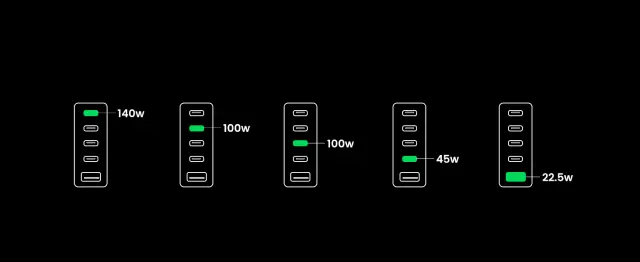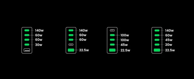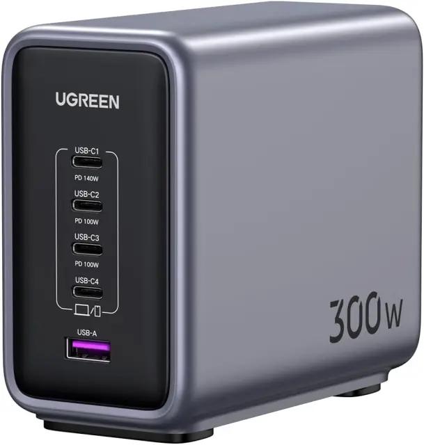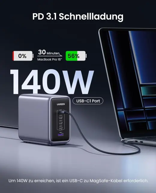inovativni 300 W polnilnik s hitrostjo polnjenja PD 3.1 podpira največ 140 W. Izhod na USB-C1 in lahko napolni MacBook Pro 2021 16 inch od 0 % do 56 % v 30 minutah. S hkratno uporabo USB C1 & C2 & C3 je mogoče doseči največjo moč 300 W (140 W + 100 W + 60 W).