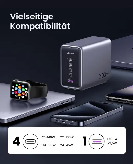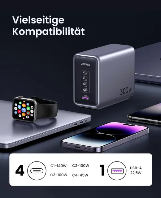 USB C polnilec 300 W s PD 3.1 je združljiv s skoraj vsemi napravami. npr. B. Združljiv z MacBook Pro 16" (M2 Pro, 2023) / 16" (M1 Max, 2021) / MacBook Air 2023/ ThinkPad X1/ Dell XPS/ Surface Book 2; iPhone 15 Pro Max/ Pro/ 15/ 14 / 14 Plus / 14 Pro / 14 Pro Max / 13 / 13 mini / 13 Pro. / / 13 Pro Max /12 / 12 Pro / 12 Pro Max / 12 mini / SE 2 / SE 3 / Galaxy S23 / S23+ / S23 Ultra / S22 / S22+ / S22 Ultra / S21 / S21+ / S21 Ultra / Note20 / Note 20 Ultra itd.