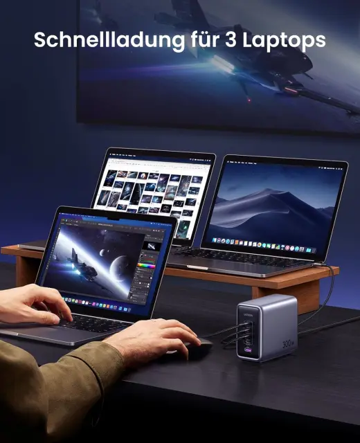 Zahvaljujoč odlični zmogljivosti polnjenja lahko polnilnik GaN napaja 3 prenosne računalnike hkrati. S 4x USB-C in 1x USB-A napajalnik USB C s 300 W hkrati polni 5 naprav, od prenosnih računalnikov do tabličnih računalnikov in pametnih telefonov, zaradi česar ste bolj produktivni v pisarni. Polnilna postaja za vse!