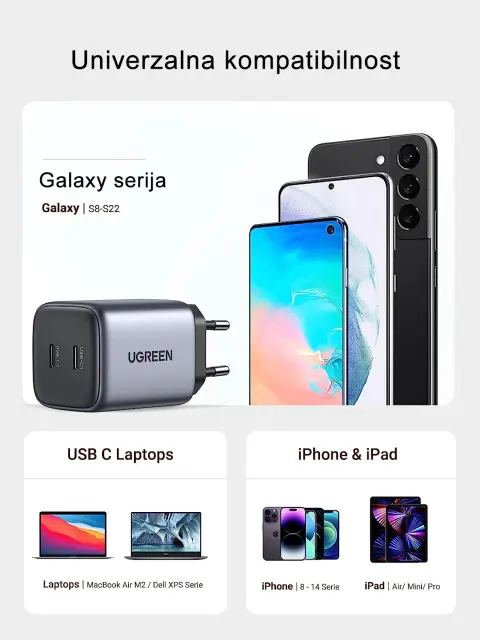 Skupaj s protokoli hitrega polnjenja za novo generacijo pametnih telefonov in izboljšanim prilagodljivim polnjenjem PPS dobi Nexode združljivost, ki je drugi napajalniki preprosto ne omogočajo. Združljiv z Galaxy S23 Ultra, S22, S21 FE, S20, S10, S8, A53, A52, Tab A8, A7, S8; Pixel 7, 7 Pro, 6 Pro, Pixel 5, 4; iPhone 14 Pro, 14 Plus, 14 Pro Max, 13 Mini, 13 Pro, 12, SE 202020202 2, 11, X; Watch 8, 7, Watch SE, HomePod? iPad Pro M1/Air/mini? MacBook Air 2020/2022 M2, prenosni računalnik XPS 13, AirPods Pro, Steam Deck, Switch in več.