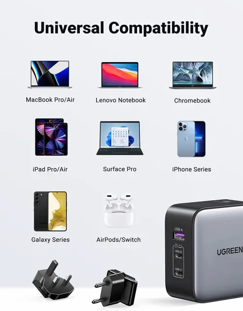 Ugreen 65W potovalni polnilec z različnimi nastavki za vtičnice je združljiv s prenosniki, pametnimi telefoni, tablicami, slušalkami, Nintendo Switch, Steam Deck in drugimi napravami USB-C!