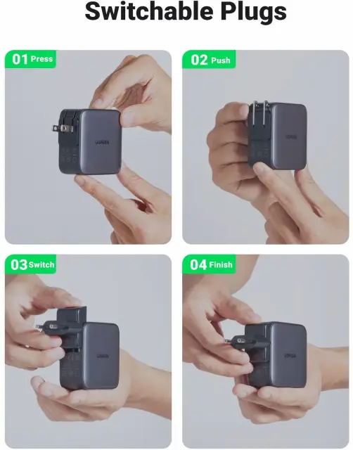 zaradi preklopnih vtičev v EU, ZDA in Združenem kraljestvu je polnilnik USB C zelo koristen in primeren za potovanja po vsem svetu ter podpira univerzalno napetost 100 V–240 V po vsem svetu.