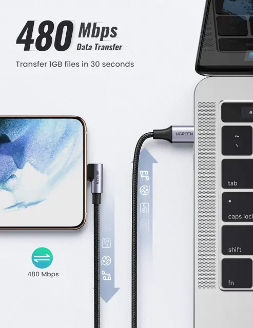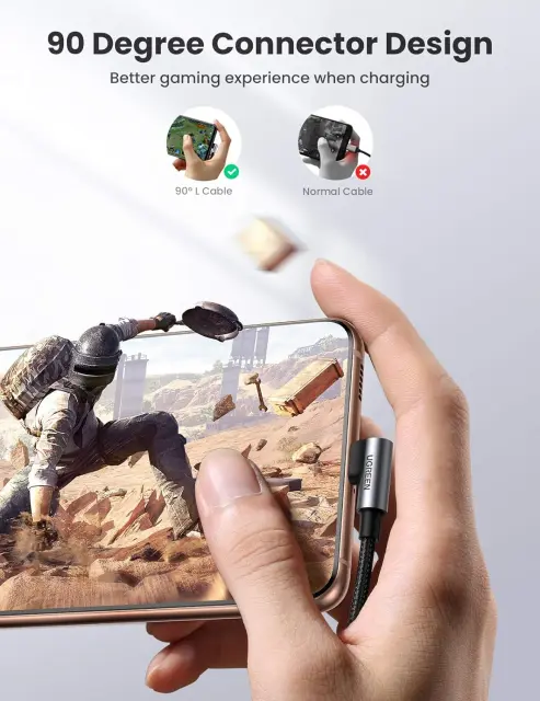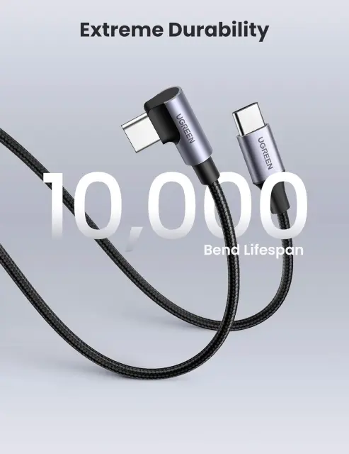 UGREEN 90-stopinjski kabel USB C, zasnovan za zmanjšanje obremenitve konca od upogibanja do tesnega, zmanjša obremenitev in podaljša življenjsko dobo, hkrati pa zagotavlja udobnejši oprijem za polnjenje in deskanje.