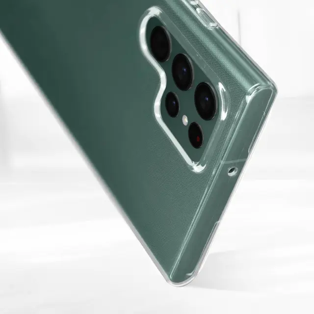Ovitek za Samsung Galaxy S22 Ultra iz upogljivega silikonskega gela, odporen na praske in udarce. Ta prozorna zašcita je opremljena s premazom proti prstnim odtisom in proti porumenelosti. Pušca funkcionalnosti dostopne in dizajn viden.