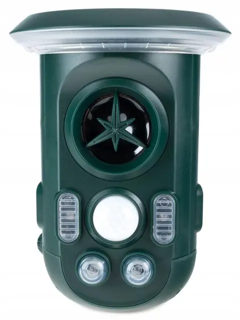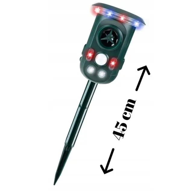 Učinkovit odganjalec živali, ki deluje na principu oddajanja različnih ultrazvočnih frekvenc in močne LED svetlobe.