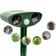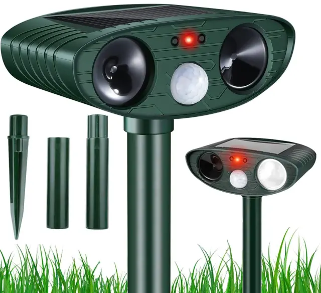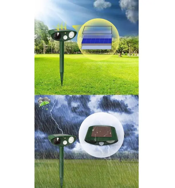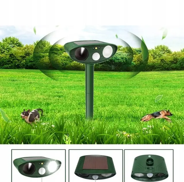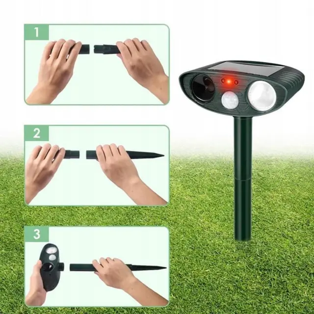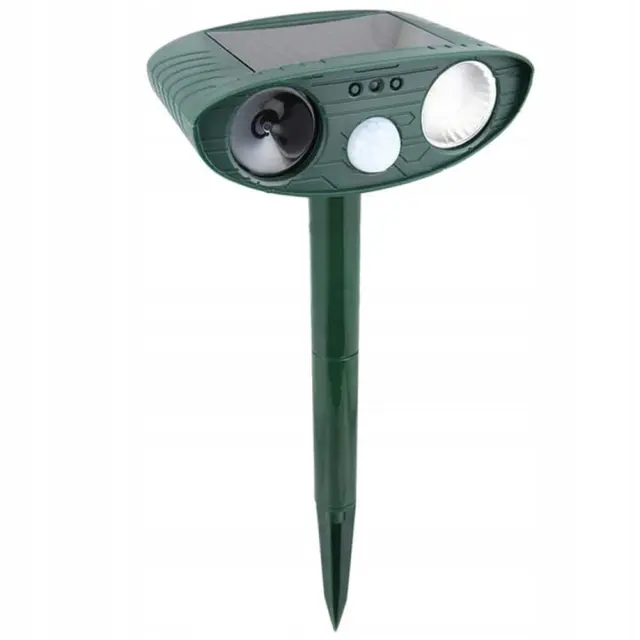 Znebite se nadležnih živali že enkrat na human način! Naš odganjalec uporablja sodobno ultrazvočno tehnologijo, ki učinkovito odganja živali v okolici. Neznosni zvoki se oddajajo na frekvencah, ki jih lahko slišijo le živali, zato naprava nikakor ne draži ljudi v okolici. Idealen je za vrt, parcelo, njive, sadovnjake in mnoge druge. Poskusite na svojem vrtu in ne bo vam žal!Odganjalec hišnih ljubljenčkov se napaja s sončno energijo , ki jo zbira solarna plošča na vrhu ohišja. To vam omogoča prihranek časa in energije, saj vam ni treba nenehno polniti naprave ali menjati baterije v njej. Za zmanjšanje izgube energije, ki se nabere čez dan, je naprava opremljena s senzorjem gibanja, zahvaljujoč kateremu začne oddajati ultrazvok šele, ko zazna gibanje. Zahvaljujoč infrardečemu senzorju odganja živali podnevi in ponoči!Če vašo vzrejo rastlin opustošijo ptice, kokoši pogrizejo lisice, nenehno naletite na pogrizene električne napeljave s kunami ali pa vas je preprosto strah za zdravje vaših bližnjih zaradi nevarnosti srečanja z divjadjo, potem je ta izdelek pravi zate! Naprava učinkovito deluje na:psimačkepticelisicedivjejelenzajcivevericein mnogi drugi!Pozor! Naprava ne deluje na krtih in drugih živalih, ki živijo pod zemljo.human in učinkovit način ravnanja z divjimi živalmisenzor zaznavanja gibanja zažene napravodela dan in nočvodoodporennamestitev v tlagumb za vklop/izklopsončna celicaNapajanje : 4x AA NiCDP baterijePoraba energije : stanje pripravljenosti – 0,8 mAh,Način delovanja – 15mAhFrekvenca signala : 18-40KhzDomet : do 225 m2