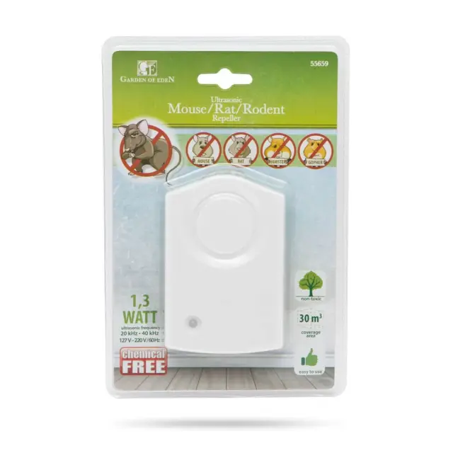 Elektronski odganjalec miši in podgan, ki oddaja ultrazvočne valove, lahko učinkovito odžene miši, podgane in druge neprijetne škodljivce 24 ur na dan. Zahvaljujoč preprosto oblikovani zunanjosti, ne vpliva na dekoracijo vašega doma. Naprava ne uniči škodljivcev, ampak jih zadrži stran od naprave. Naprava doseže pravo učinkovitost po 48 urah namestitve. Napravo lahko priključite na običajno 230V vtičnico, tako da vam ni treba zamenjevati baterij.