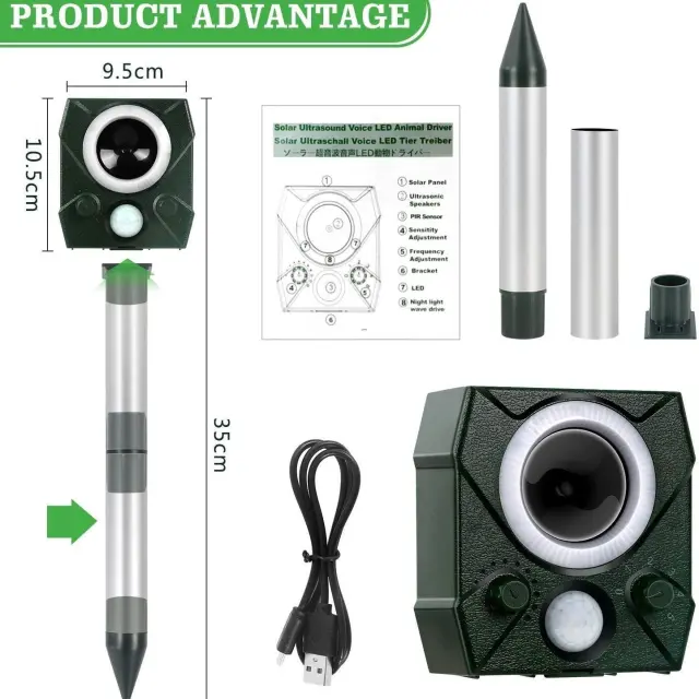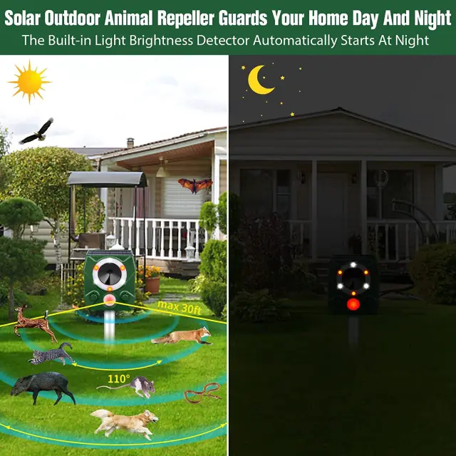 Na sončno energijo: Odvračalec škodljivcev ima vgrajeno sončno ploščo, ki zmanjšuje odvisnost od tradicionalnih virov energije in spodbuja energetsko učinkovitost. Ta funkcija zagotavlja neprekinjen nadzor nad škodljivci, hkrati pa zmanjšuje vpliv na okolje.