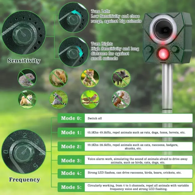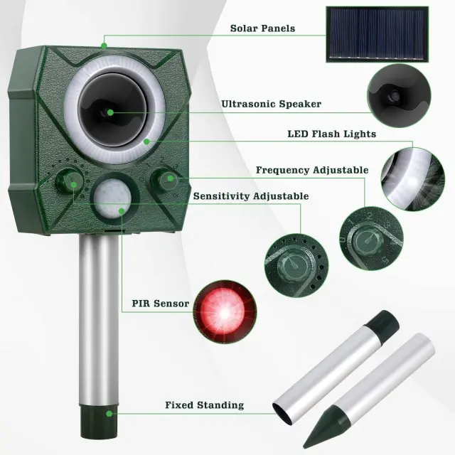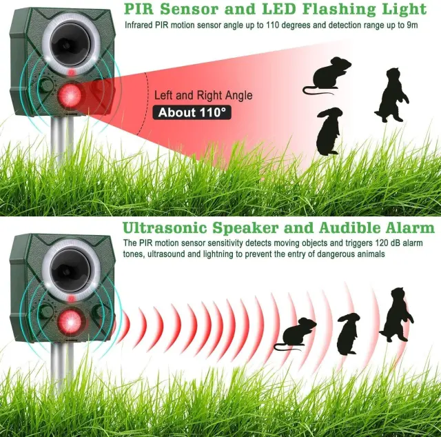 Infrardeča senzorska tehnologija: Ta zatiranje škodljivcev uporablja napredno infrardečo senzorsko tehnologijo za zaznavanje prisotnosti glodalcev v svojem dosegu. Ko je zaznan, oddaja močne ultrazvočne valove, ki so zelo učinkoviti pri odvračanju škodljivcev, vendar so neslišni za ljudi in večino hišnih ljubljenčkov.
