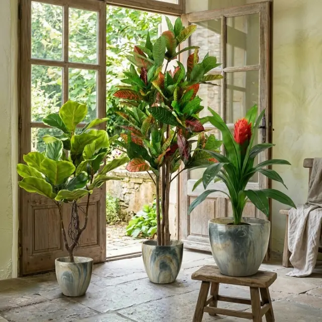 Vzdrževanje je enostavno: liste občasno obrišite z rahlo vlažno krpo, da odstranite prah. Za ohranjanje videza priporočamo, da rastline ne izpostavljate pretirani vlagi in neposredni močni sončni svetlobi. Material: plastika. Barva: zelena/krem. Količina: 1 kos.
