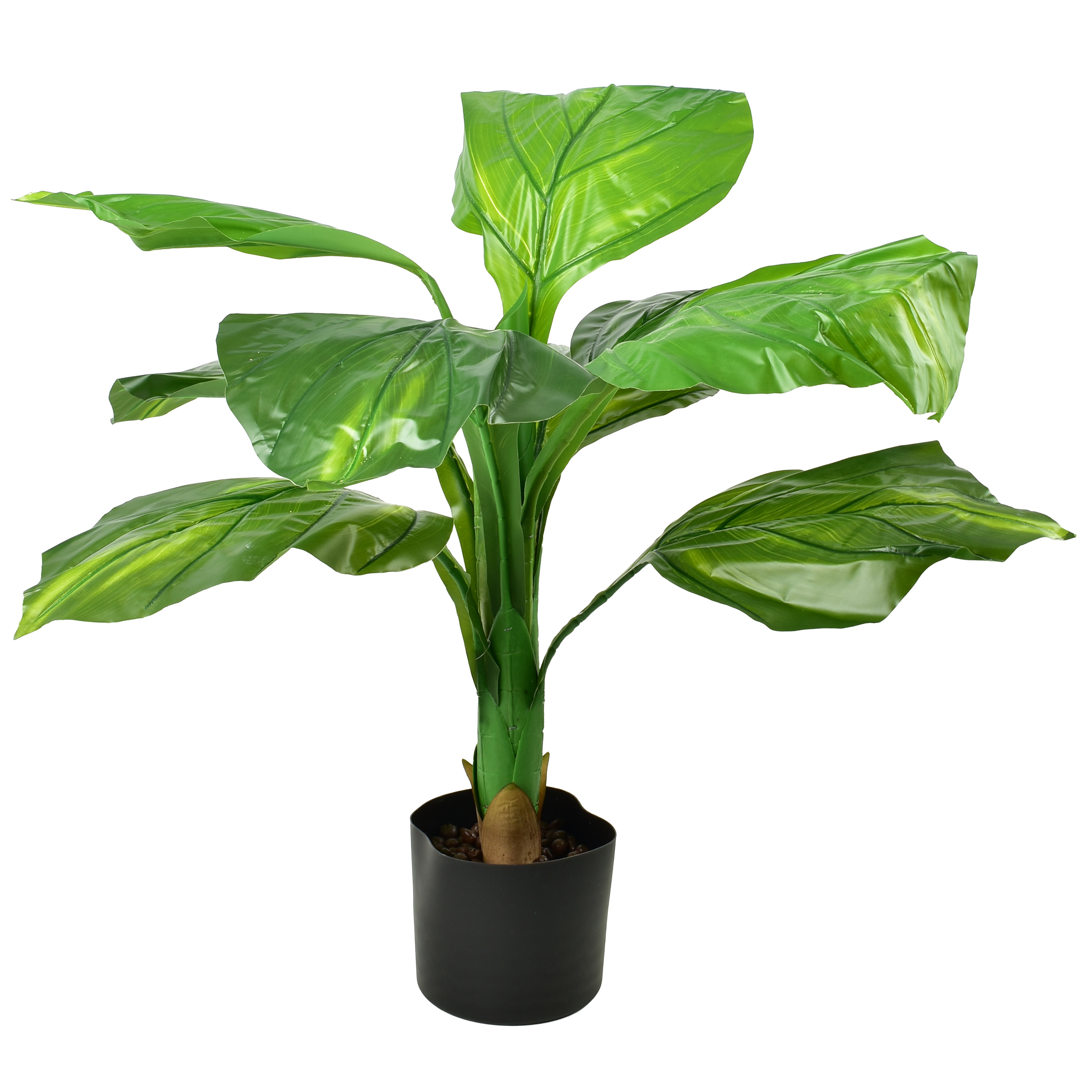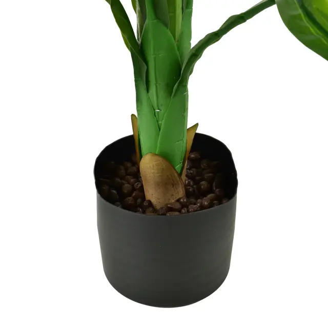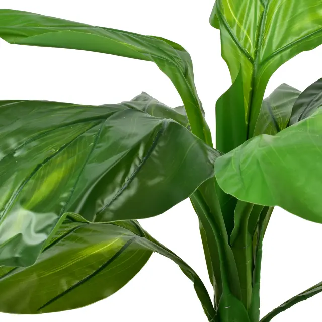 Rastlina je visoka 80 cm in je nameščena v stabilen plastičen lonček velikosti 15 x 13 cm, kar omogoča enostavno postavitev na tla, ob omarico ali v kot prostora. Primerna je tudi za prostore z manj naravne svetlobe, kjer žive rastline pogosto ne uspevajo. Listi imajo rahlo sijoč zaključek, ki poudari urejen in svež videz.
