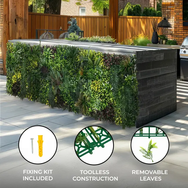 Te ploščice dimenzij 100 cm x 100 cm ponujajo široko pokritost, kar vam omogoča, da brez težav ustvarite videz realistične rastlinske stene. Zasnovana je tako za učinek kot za praktičnost, njihova strukturirana, a prilagodljiva oblika pa zagotavlja brezhibno prileganje, ne glede na to, ali polepšate majhno površino ali prekrivate celotno površino z živahnim zelenjem.