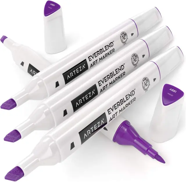 Set umetniških markerjev ARTEZA EverBlend v vijolični barvi je zasnovan za ljubitelje ustvarjanja vseh starosti, ki iščejo zanesljive pripomočke za svoje projekte. Ti markerji na alkoholni osnovi so opremljeni z dvojno konico, kar omogoča prehajanje med različnimi umetniškimi tehnikami, kot so slikanje, barvanje in skiciranje. Zaradi visoke vsebnosti pigmenta v črnilu so barve bogate in žive, kar omogoča doseganje profesionalnih rezultatov na številnih podlagah. Markerji so primerni za uporabo na različnih materialih, vključno s papirjem, steklom, lesom in plastiko, kar odpira široko polje ustvarjalnih možnosti.