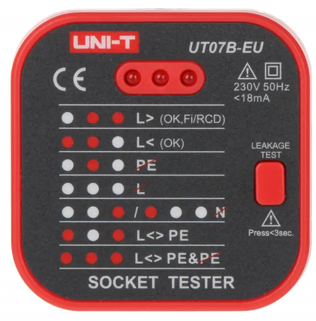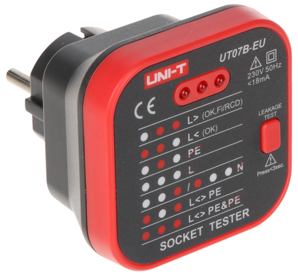 Tester UT07B-EU zagotavlja prikaz pravilne priključitve vodov L, N, PE v električni vtičnici. Poleg tega vključuje funkcijo za preizkušanje učinkovitosti delovanja diferenčno-tokovnih izklopnih naprav (RCD).