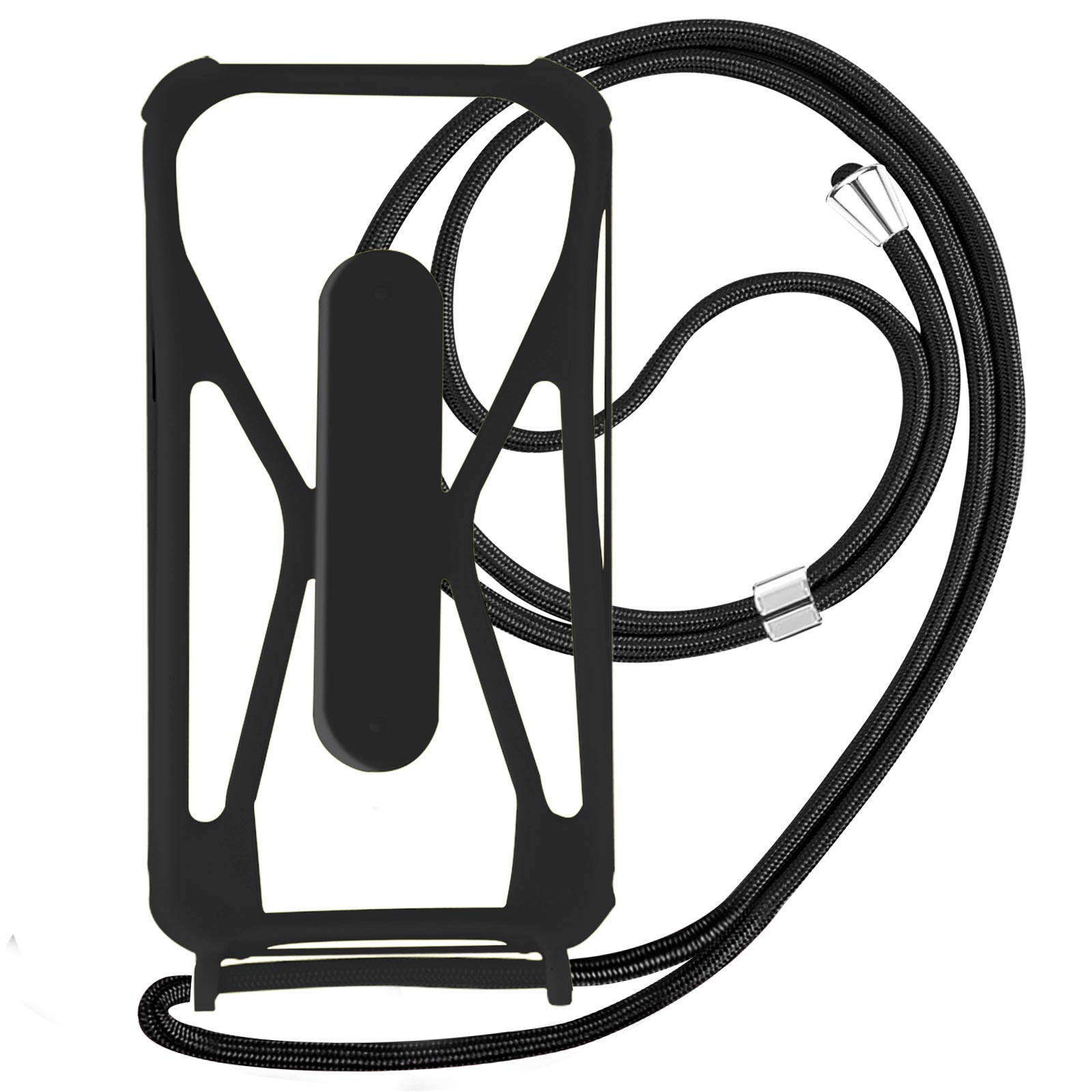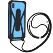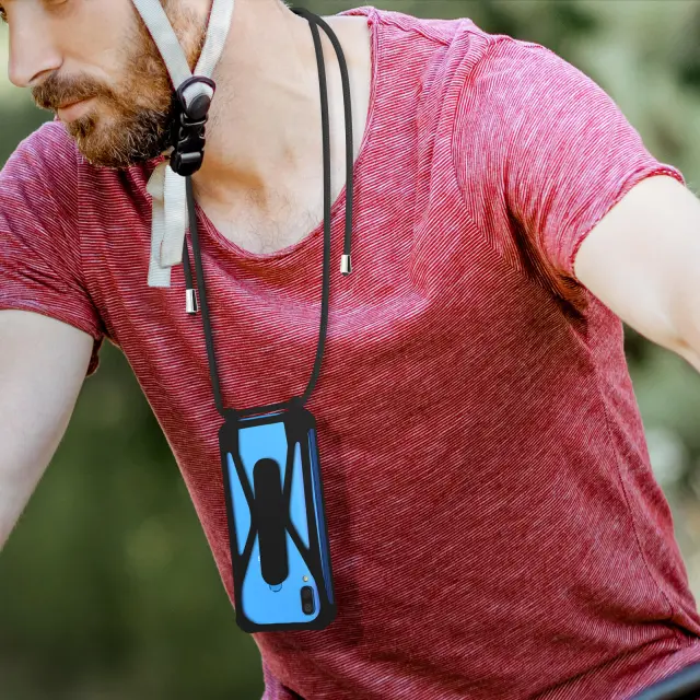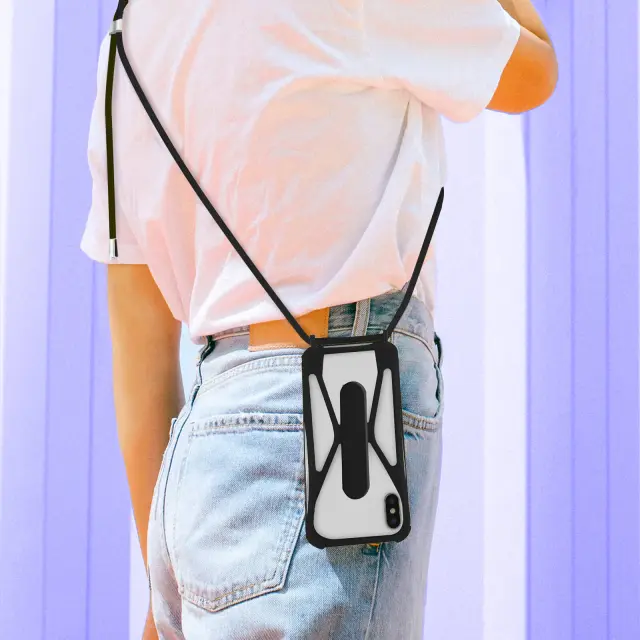 Crna torbica za kabel za pametni telefon s konturami odbijaca, ki šciti pred udarci in padci. Ta univerzalna školjka ima nastavljivo stojalo, ki deluje kot podpora za video. 80 cm dolga vrvica omogoca enostaven transport in varen oprijem.