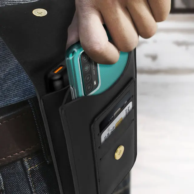 Torbica za pas za pametne telefone z vec žepi za shranjevanje in prenašanje vašega mobilnega telefona in vaših stvari kamorkoli greste. Torbica za pas z 2 velikima glavnima žepoma in 3 žepi za kartice. Ovitek z vec žepi z zapiranjem na magnetni gumb.