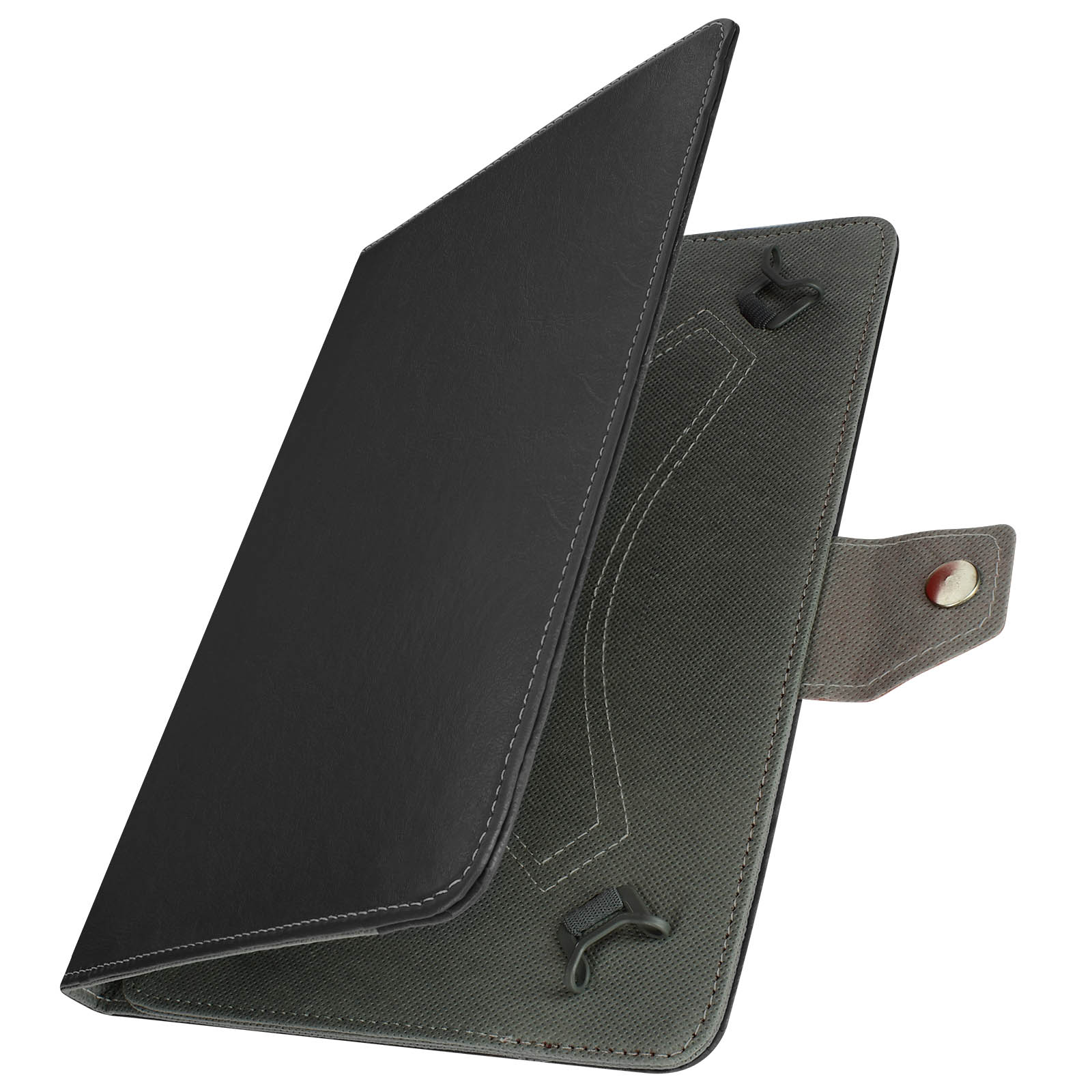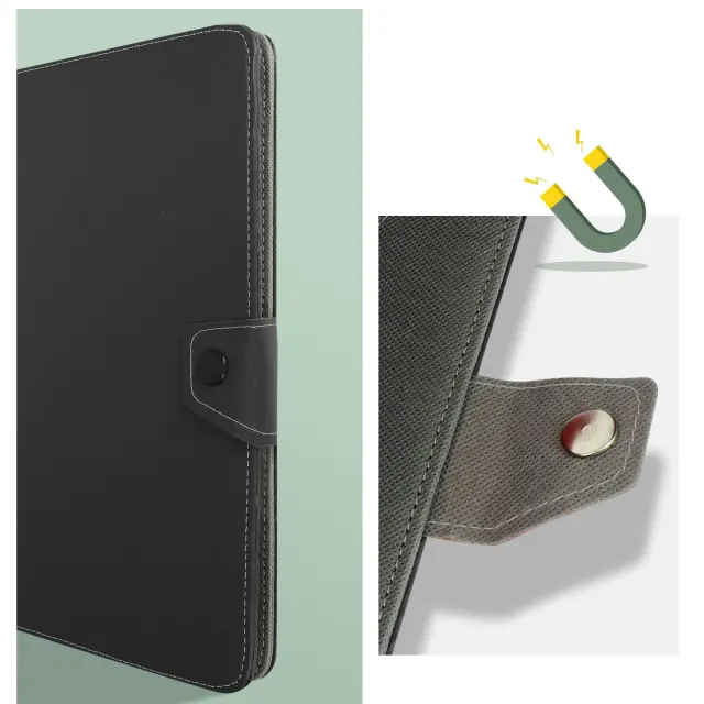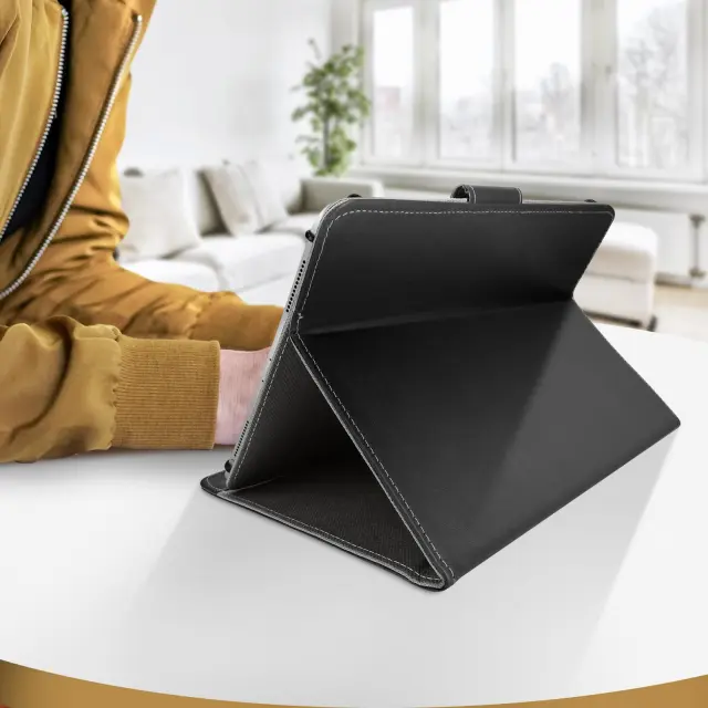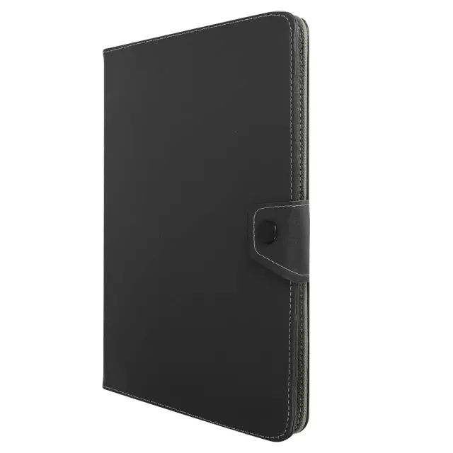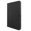 Univerzalni crni ovitek z ucinkom postaranega usnja za zašcito vašega tablicnega racunalnika v celoti in hkrati elegantnega dizajna. Prakticen, njegova loputa se zloži za zagotavljanje video podpore. Združljiv s katero koli 10-palcno tablico.