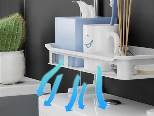 Prostorne police bodo sprejele različne majhne predmete. Zahvaljujoč organizatorju boste izkoristili neizkoriščen prostor nad straniščem in ustvarili veliko dodatnih predelkov, kjer lahko shranite detergente, pralni prašek, šampon, kopalni gel itd.