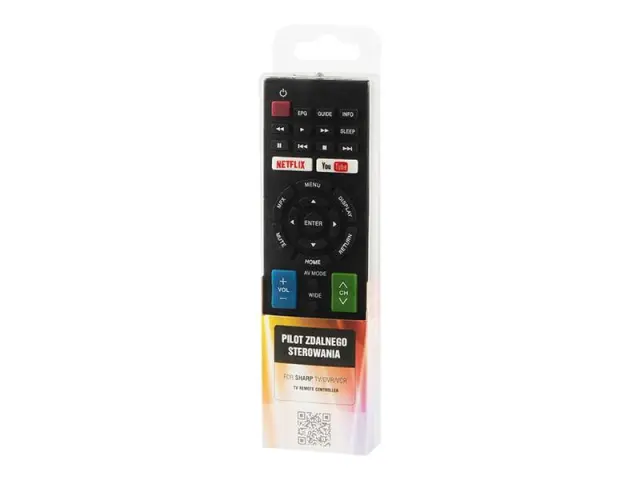 Univerzalni daljinski upravljalnik, ki omogoča upravljanje naslednjih Sharp naprav: TV, VCR, DVR. Izdelek ima potrebne gumbe za osnovno delovanje teh naprav ter dodatno ločene gumbe za zagon priljubljenih storitev Netflix in Youtube. Enostavna oblika in postavitev zagotavljata popolnoma enostavno in intuitivno upravljanje. Za izdelavo pilota so bili uporabljeni visokokakovostni materiali, ki zagotavljajo dolgo obstojnost izdelka. Idealen za nadzor vaše naprave, ko se tovarniški daljinski upravljalnik izgubi ali poškoduje.